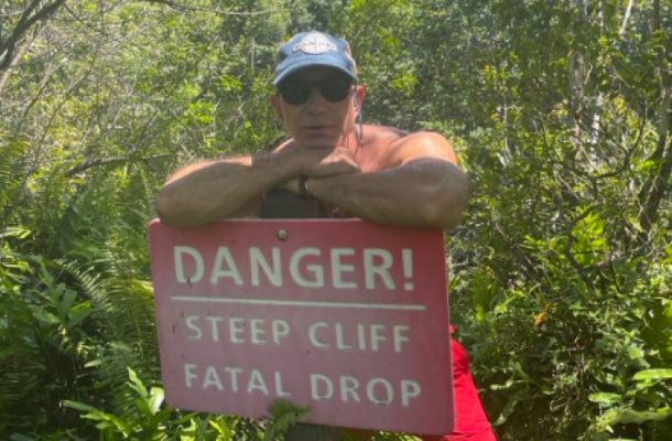 „Лео, дојди овде, сакам да ти покажам нешто“, напиша Безос и приложи фотографија на која е фотографиран над табла со која се означува опасност и на неа пишува „Стрмна карпа, Фатален пад“.