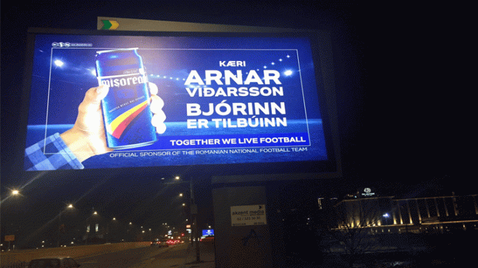 „Драг Арнод Видарсон, пивото е подготвено“, пишува во пораката на билбордот поставен од еден од спонзорите на романската фудбалска федерација.