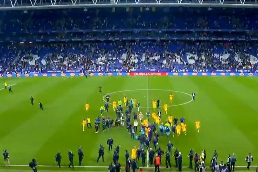 Најголем дел од навивачите на Еспањол со свирежи го испратија славењето на лутиот градски ривал, но оние најрадикалните собраа храброст и влетаа на теренот.