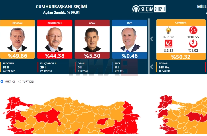 Според резултатите на турската државна новинска агенција Анадолија, во трката за претседател на Турција се преброени 90,61 отсто од гласовите, а актуелниот претседател Реџеп Тајип Ердоган падна на помалку од педесет отсто од гласовите.