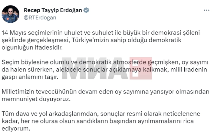 Турскиот претседател Реџеп Тајип Ердоган ја повика опозицијата да избегнува да извлекува „избрзани“ заклучоци додека е во тек она што тој уверува дека е „демократско“ пребројување на гласовите.