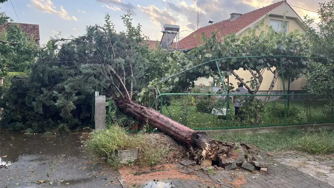 Во Кочани и Виница, пак, е предизвика материјална штета на кровни конструкции на неколку објекти, а од врнежите од град со големина на лешник оштетени се овошки и градинарските култури.