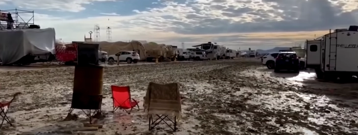 Околу 70 илјади луѓе остануваат блокирани на местото на фестивалот, бидејќи дождот го претвори пустинскиот песок во длабока, лизгава кал. Влезните и излезните патишта се затворени затоа што возилата едвај возат по нив.