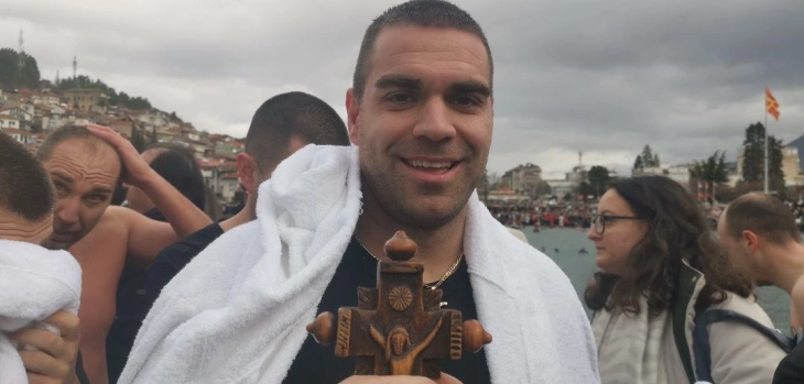 Никола Јакимоски од Охрид денеска беше најсреќен меѓу охриѓани. Тој беше највешт меѓу неколкуте стотини верници и успеа да го извади Чесниот крст од осветените води на Охридското Езеро.