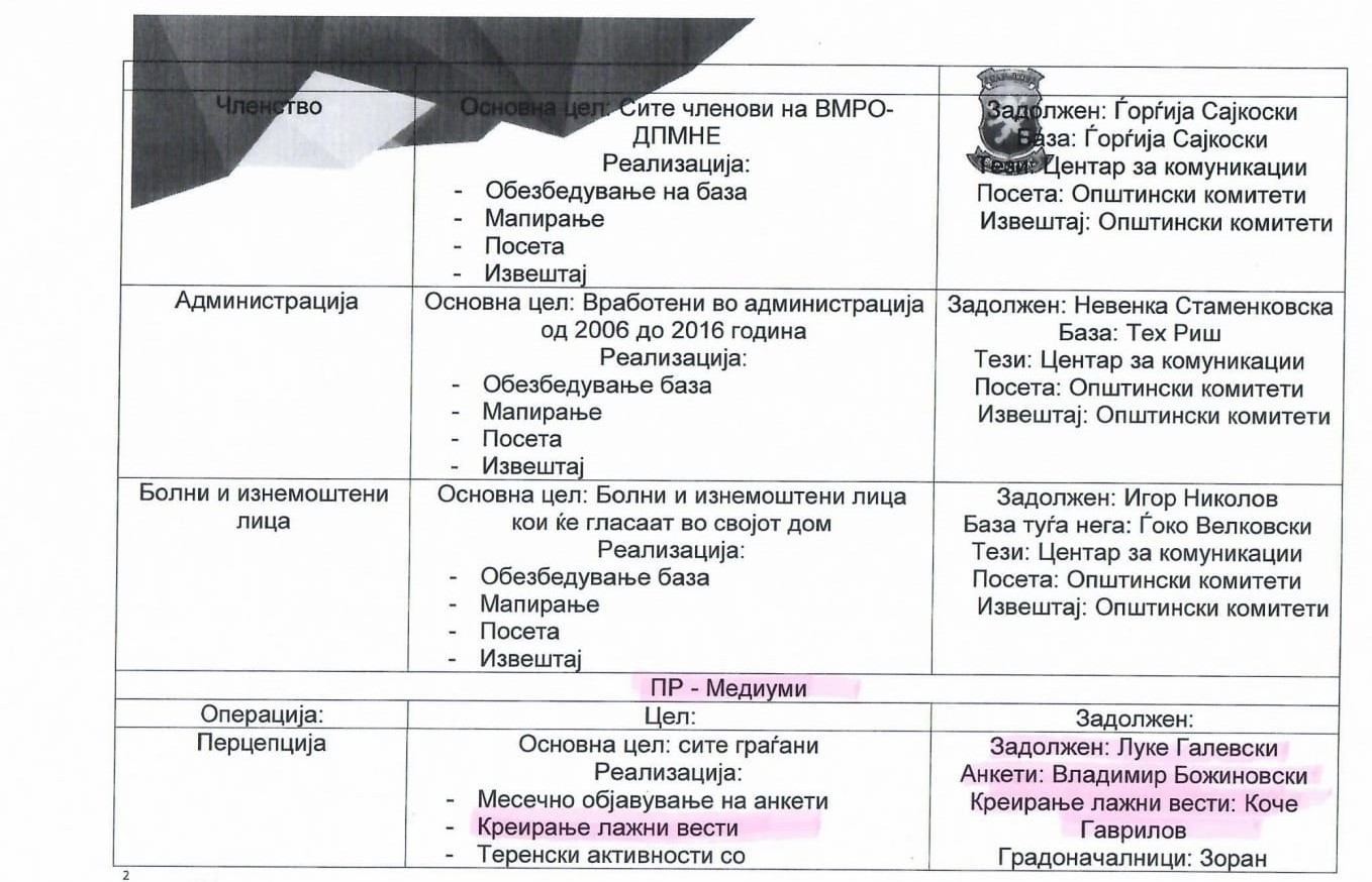 На објавените документи од две страници јасно се гледа дека дел од Републичкиот изборен штаб на ВМРО-ДПМНЕ имал задача да креириа лажни вести и да реализира анкети. Задолжен за тоа освен шефот на центарот за комуникации на ВМРО-ДПМНЕ Луке Галевски, бил и Владимир Божиновски сопственик на Агенцијата ИПИС која од 31 јануари па до денес прави анкети за МТВ.